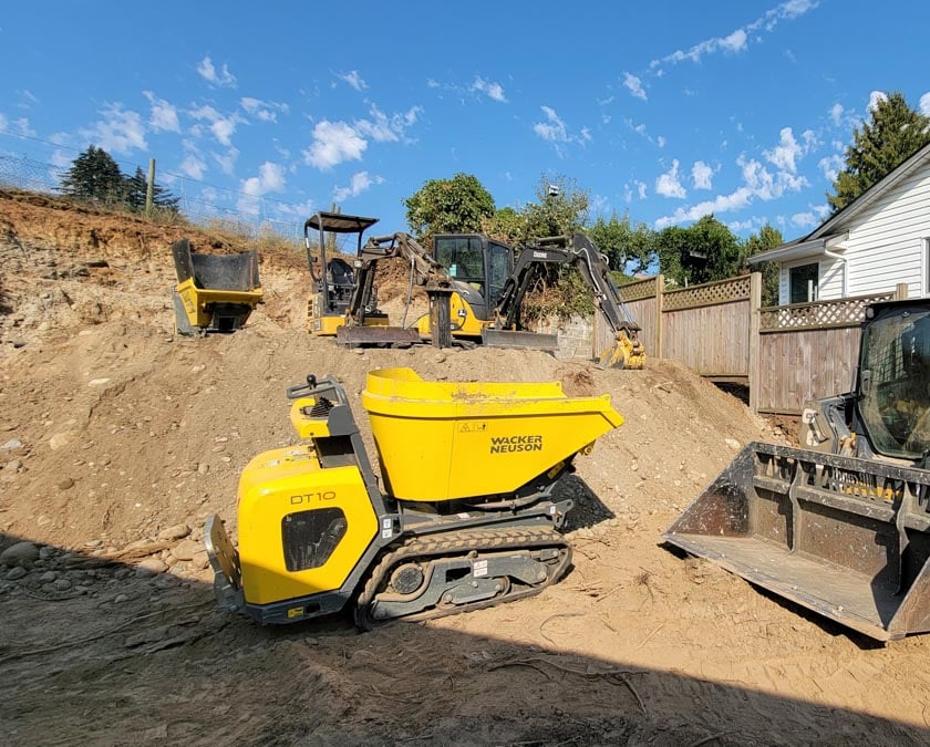 Our track dumpers (think of a big wheelbarrow on tracks) allow us to bring in the right amount of gravel fast and up hills and tight spaces.