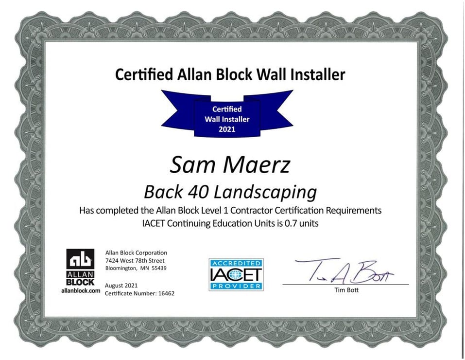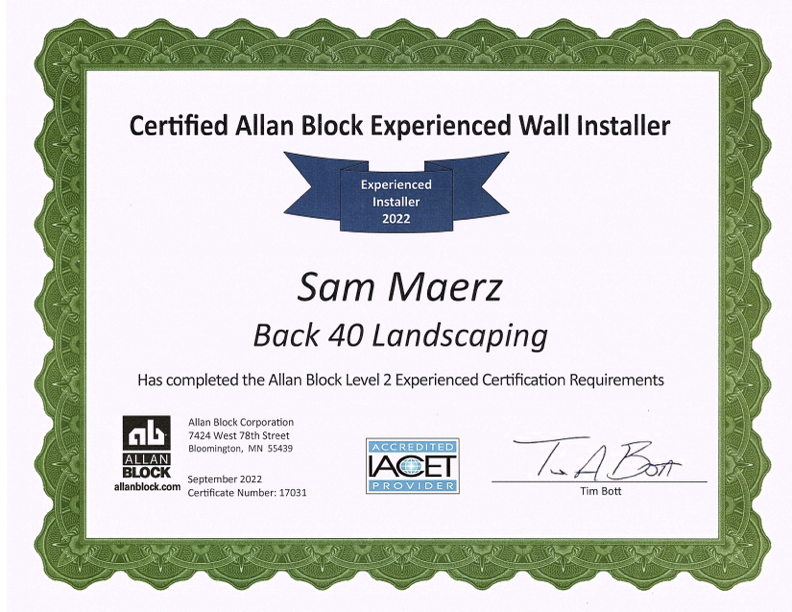 Back40Landscaping’s staff are trained and certified by Allan Block, with ongoing training from Allan Block professionals after every single retaining wall build.