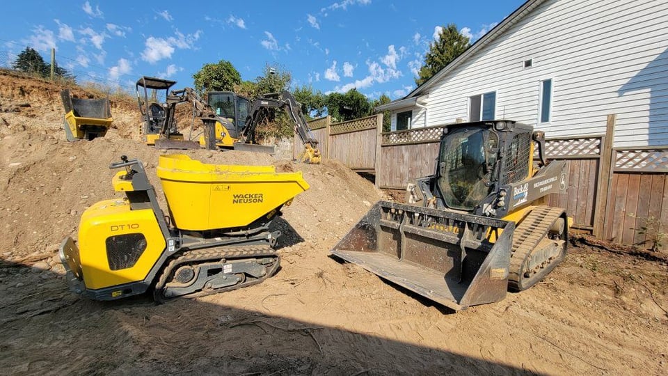 Once the soil is excavated it's moved to the front yard via our Wacker Neuson DT10 Track dumpers. These machines carry the equivalent of 6-8 wheelbarrow loads, and have no problem working all day going up or downhill.