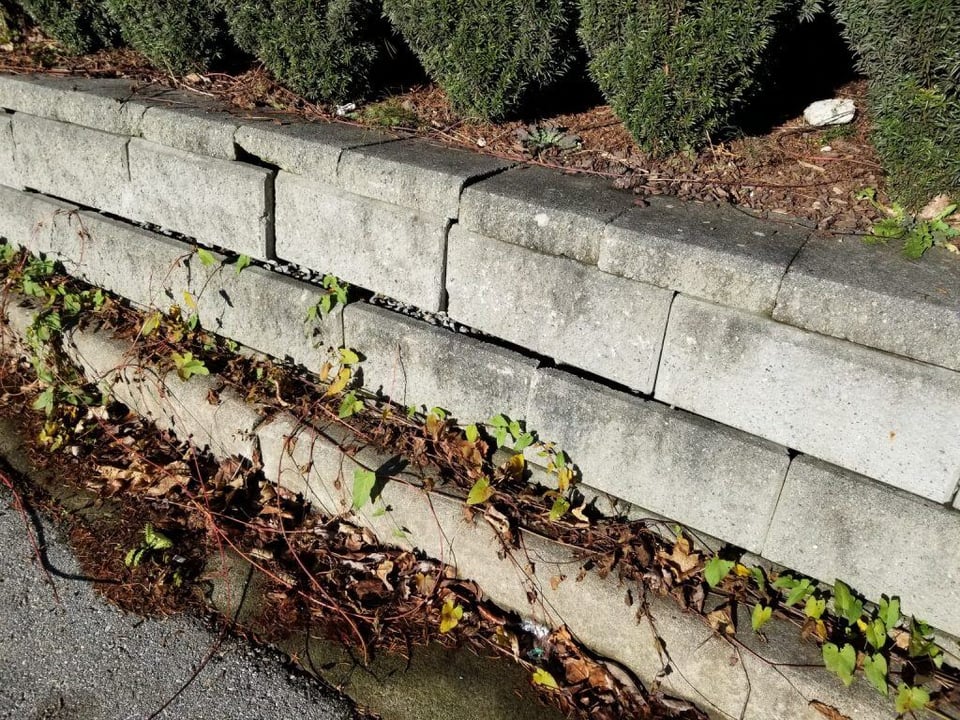 The retaining wall blocks below are failing because there is no gravel behind the wall.