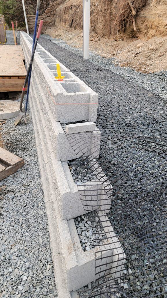 An engineered retaining wall is not built the same as a small gravity RW. As well as the costs for engineering and permits there will be considerably more costs associated with building the wall with reinforcements. This means more excavation and soil removal, more gravel placed behind the RW, and the installation of Geogrid (a structural netting that combines the wall and gravel together as one unit).