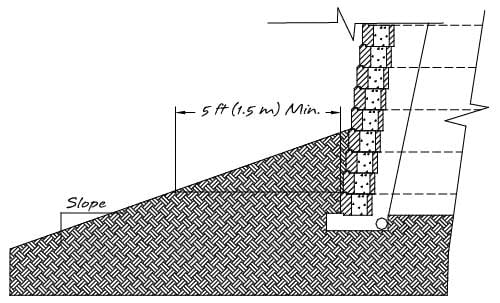 Slopes below the wall will require additional block to be buried in the ground. The Allan Block spec for how much block to bury is enough to create a level space of 5-7’ in front of the wall.