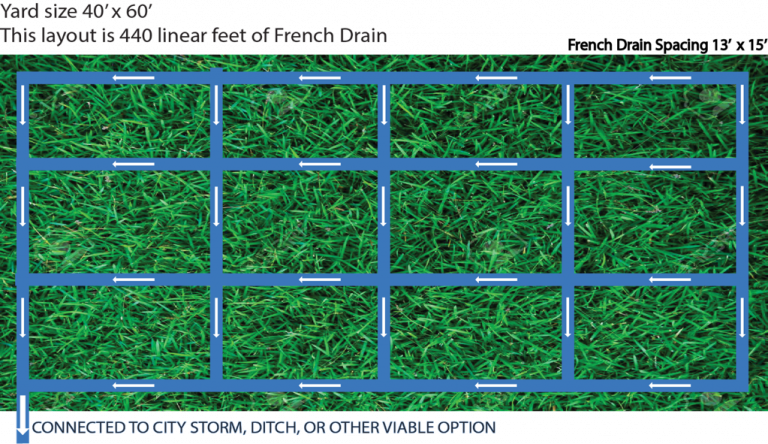 The layout (and amount) of the pipe placed in your yard is important because the pipe that is in the ground absorbs surface and subsurface groundwater, and makes it disappear to the designated area. The more water that gets into your system, the dryer your yard will be. This means that the more pipe that is placed in your yard, the better the drainage system. The best layout is different for each yard and space.
